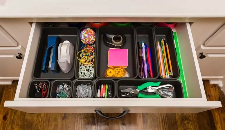 - Group similar items together: pens, cables, snacks, sticky notes, etc.