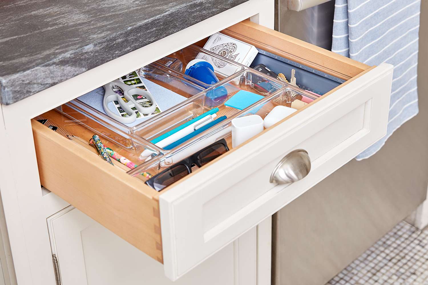 - Stack bins or trays to create levels within the drawer, especially helpful in tall, deep drawers